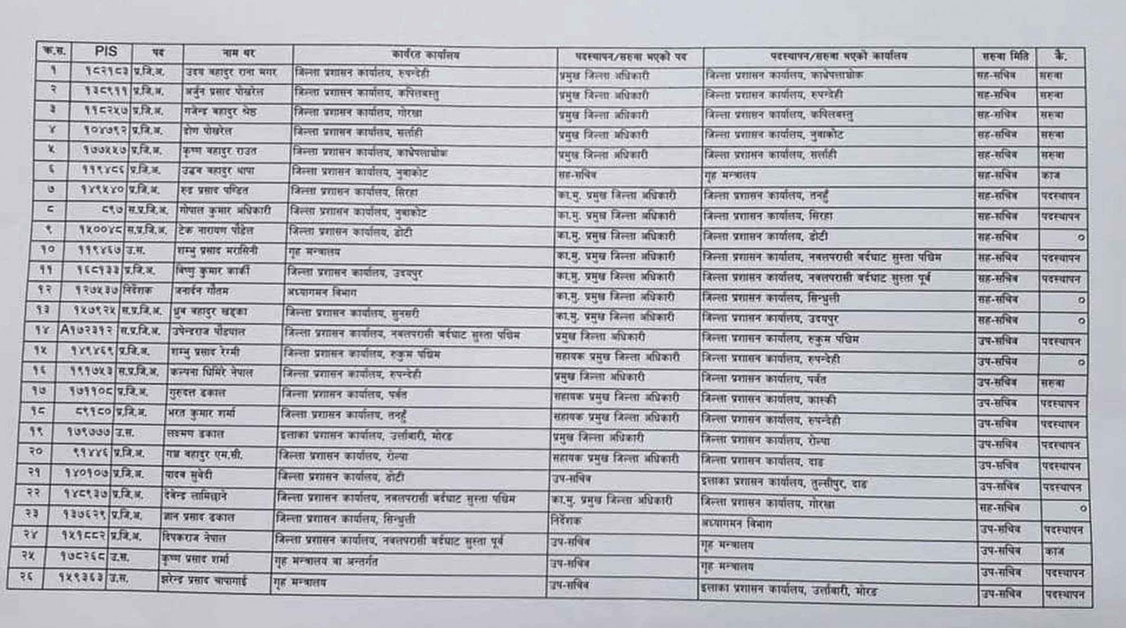 रुपन्देही, कपिलवस्तु, गोरखा, सर्लाही, काभ्रे, नुवाकोट, सिरहा, डोटी, उदयपुर, सुनसरी, नवलपरासी (सुस्ता पश्चिम), रुकुमलगायतका महत्वपूर्ण जिल्लाका प्रमुख जिल्ला अधिकारी, सहायक प्रमुख जिल्ला अधिकारी र निर्देशकहरुको सरुवा तथा पदस्थापन गरेको छ ।
