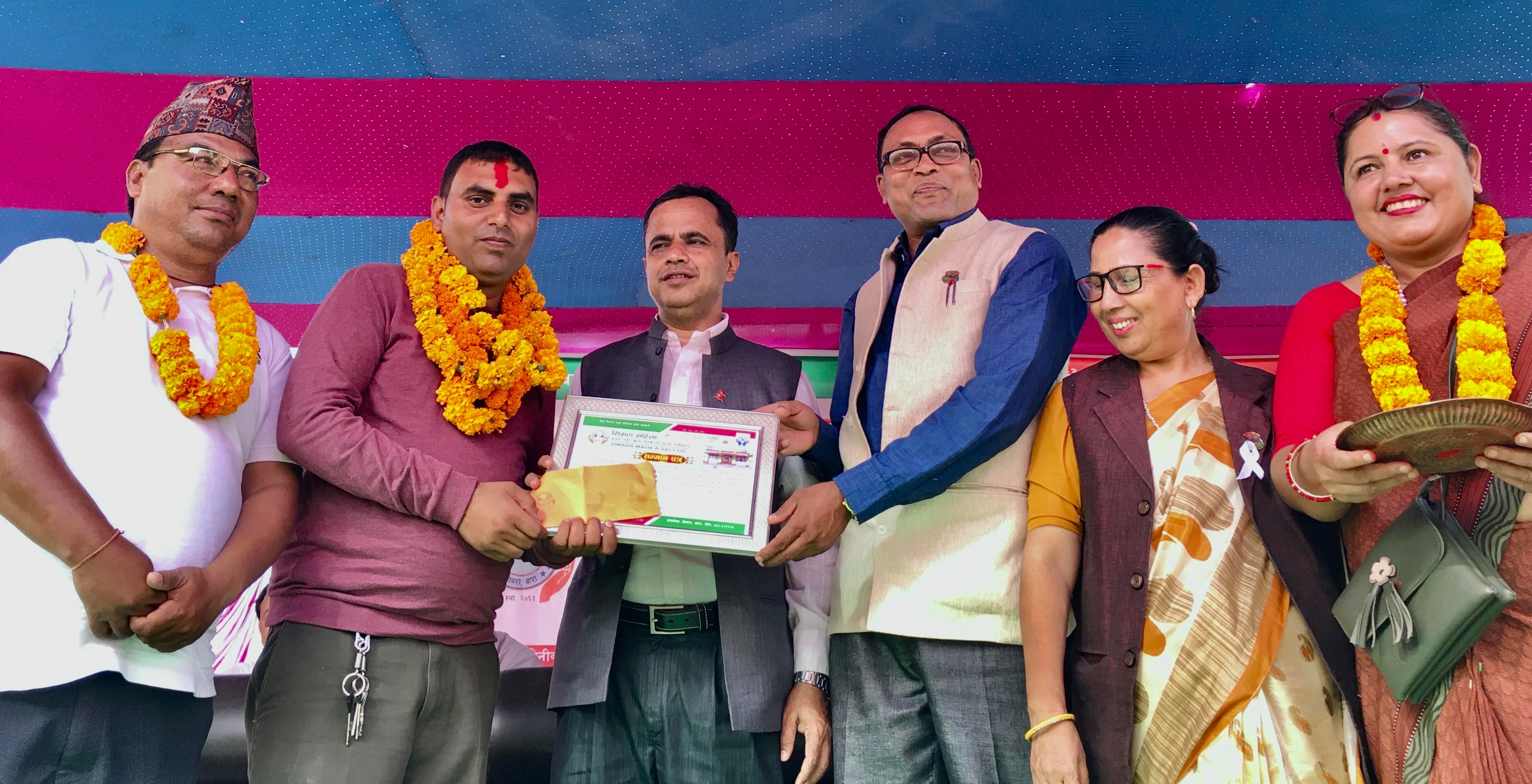 सिमरामा रहेको महिला सहकारीले सन्चारकर्मी अनिल तिवारीलाई सम्मानित गरेको छ । तिवारीलाई नगद रु ५ हजार र कदर पत्र सहित सम्मान गरीएको हो । समाचारको माध्यमबाट सहकारीलाई सबैको माझमा चिनाउन र समाजमा स्थापित गराउन महत्वपुर्ण भुमिका निर्वाह गरेको भन्दै संचाकर्मि तिवारीलाई सहकारीले नगद सहित सम्मानित गरेको हो ।