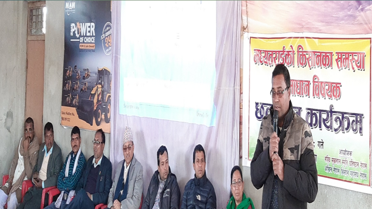 मध्यतराईका किसानका समस्या र समाधान विषय छलफल कार्यक्रम बाराको कलैयामा सुरु भएको छ । बारा पर्सा र रौतहटका किसानहरुको सहभागिता रहेको कार्यक्रम शहिद मुखलाल स्मृति प्रतिष्ठान र अखिल नेपाल किसान महासंघ नेपालले संयुक्त रुपमा आयोजना गरेको हो । कार्यक्रममा पूर्व मन्त्री तथा मुखलाल  स्मृति प्रतिष्ठान नेपालका अध्यक्ष पुरुषोत्तम पौडेल प्रदेशसभाका सदस्य सुन्दर बहादुर विश्वकर्मा सिता गुरुगं संविधानसभाका सदस्य जयराम दाहाल लगायतको उपस्थिति रहेको रहेकोछ । जिल्ला कृषि ज्ञान केन्द्र बाराका प्रमुख जितेन्द्र यादवले कार्यपत्र प्रस्तुत गर्नुभएको छ त्यसै गरेर विभिन्न कृषि क्षेत्रसँगका विज्ञले कार्यपत्र प्रस्तुत गर्ने कार्यक्रम रहेको छ । बारा पर्सा रौतहट लगाएत प्रदेश नम्बर २ का किसानहरुले भोगिरहेका समस्या हरु र समाधानका उपायहरु लाई सूत्रवद्ध गरी कृषि मन्त्रीस पेश गरिने प्रतिष्ठानका अध्यक्ष पुरुषोत्तम पौडेलले कार्यक्रममा जानकारी दिनुभयो । अखिल नेपाल किसान महासंघ प्रेम बरालको सभापतित्वमा भइरहेको कार्यक्रमको सञ्चालन जवाहिर अन्सारिले गर्नुभएकोथियो भने स्वागत मनोज पौडेलले गर्नुभएको थियो ।