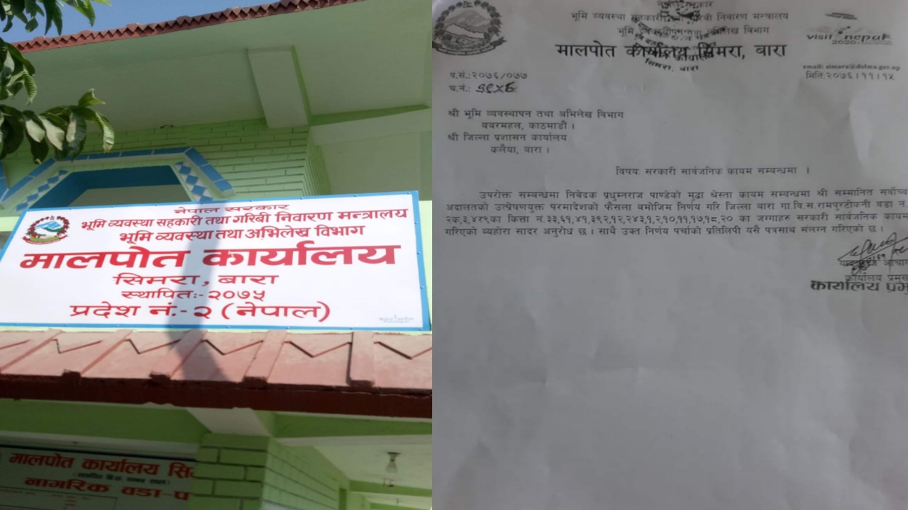 मालपोत कार्यालय सिमराले प्रद्य्युम्नराज पाण्डेका नाममा किर्ते पुर्जा बनाएर भोगचलन गरेको बाराको २० बिगाहा सार्वजनिक जग्गा बिहीबार राज्यको नाममा आएको घोषणा गरी भूमि व्यवस्था तथा अभिलेख विभाग बबरमहल, काठमाडौंलाई जानकारी गराएको छ ।