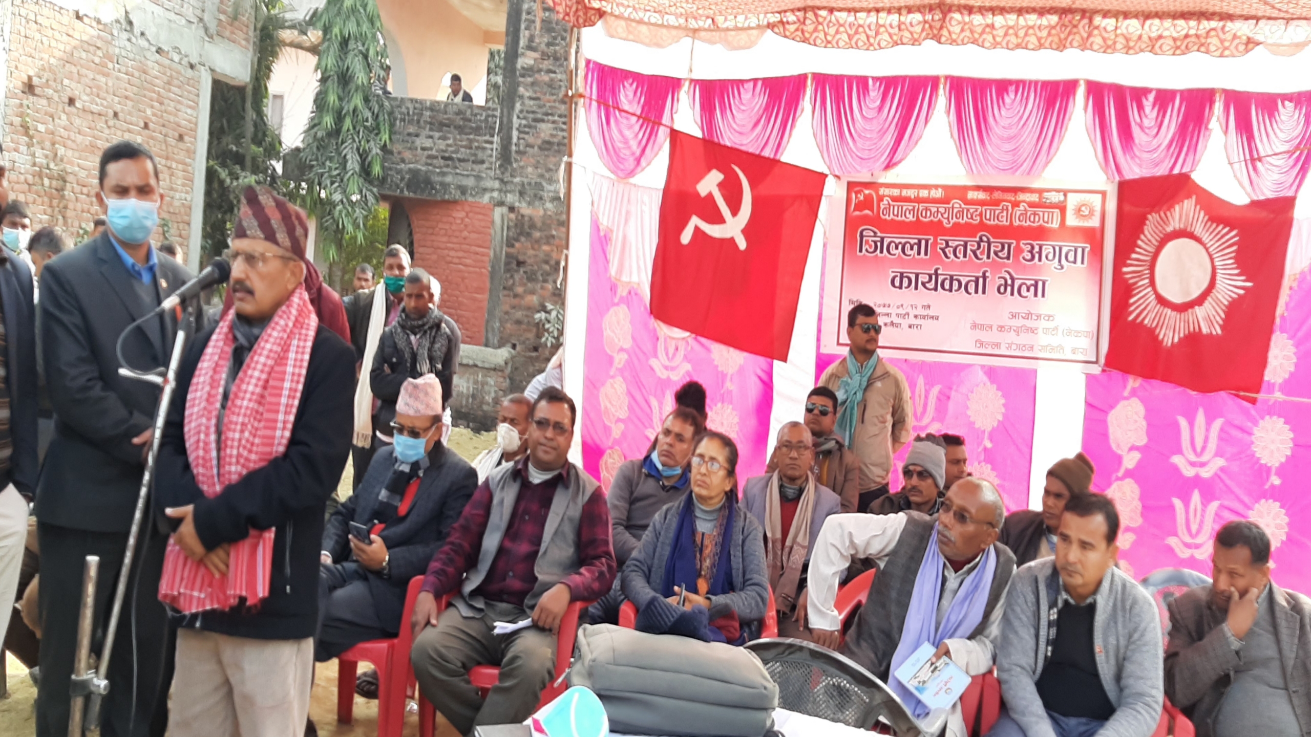 नेपाल कम्युनिष्ट पार्टी नेकपा बाराको आयोजना बाराको कलैयामा अगुवा कार्यकर्ता भेला सम्पन्न भएको छ । पौष १४ गते कलैयामा आयोजना हुने बिरोध रर्याली तयारीका लागि आज कार्यकर्ता भेलाको आयोजना गरीएको हो । नेकपा स्थायी कमिटी सदस्य तथा पुर्व शिक्षा मन्त्रि गिरीराजमणि पोखरेलले प्रधानमन्त्री ओलीका कारण देश संकटको भुमरीमा बसेको बताउनु भएको छ । उहाँले जनताले दिएको दुइतिहाइ मतको प्रधानमन्त्री ओली अपमान गरेको भन्दै संसद बिघटन गर्ने ओलीको कदम असंवैधानिक भएकोले त्यसको बिरुद्धमा लाग्न कार्यकर्ता लाइ निर्देशन दिनु भयो । नेपालको संबिधान लाई देखाउदै पुर्व मन्त्री पोखरेलले भन्नुभयो ” संबिधानले प्रधानमन्त्रीलाई संसद बिघटन गर्ने अधिकार दिएको छैन ” उहाँहरुले टेक्नु भएको संबिधान को धाराबाट संसद बिघटन हुनै सक्दैन । नेता पोखरेलले प्रधानमन्त्री ओली निरंकुश ता तर्फ अगाडी बढेकोले त्यसलाई रोक्न सडक संघर्षमा जानु परेको स्पष्ट पार्नुभयो । त्यसैगरी कार्यक्रममा बोल्दै नेकपाका नेता पूर्वमन्त्री पुरुषोत्तम पौडेलले पार्टीको निर्णय मान्दिन भन्ने अधिकार कसैलाई नभएको उल्लेख गर्दै जनताले दिएको झण्डै दूई तिहाईको मत केपि ओलीको नभएर एमाले र एमाओवादी केन्द्रका लागि दिएको स्पष्ट पार्नुभयो । उहाँले निरंकुश बन्ने अधिकार नेकपाका कुनैपनि नेता तथा कार्यकर्ता लाइ बधानले नदिएको उल्लेख गर्दे निरंकुशता बिरुद्ध लाग्न कार्यकर्ता लाइ आग्रह गर्नुभयो । नेकपा बाराका अध्यक्ष क्षेत्रबहादुर श्रेष्ठको सभापतित्व र मनोज पौडेलको सहजिकरणमा सम्पन्न कार्यक्रममा नेकपा केन्द्रीय तथा बारा सह इन्चार्ज गोपाल ठाकुर, केन्द्रीय सदस्य दिनेश राई, संबिधान सभाका सदस्य शिवचन्द्र कुशवाह,पुर्व जिबिस सभापति छठु प्रसाद यादव, संबिधान सभाका सदस्य बिमा कार्की लगायतले असंवैधानिक कदमका बिरुद्धमा एकजुट हुन आग्रह गर्नुभएको थियो । कार्यक्रममा स्वागत महमद समिउल्लाहले गर्नुभएको थियो ।