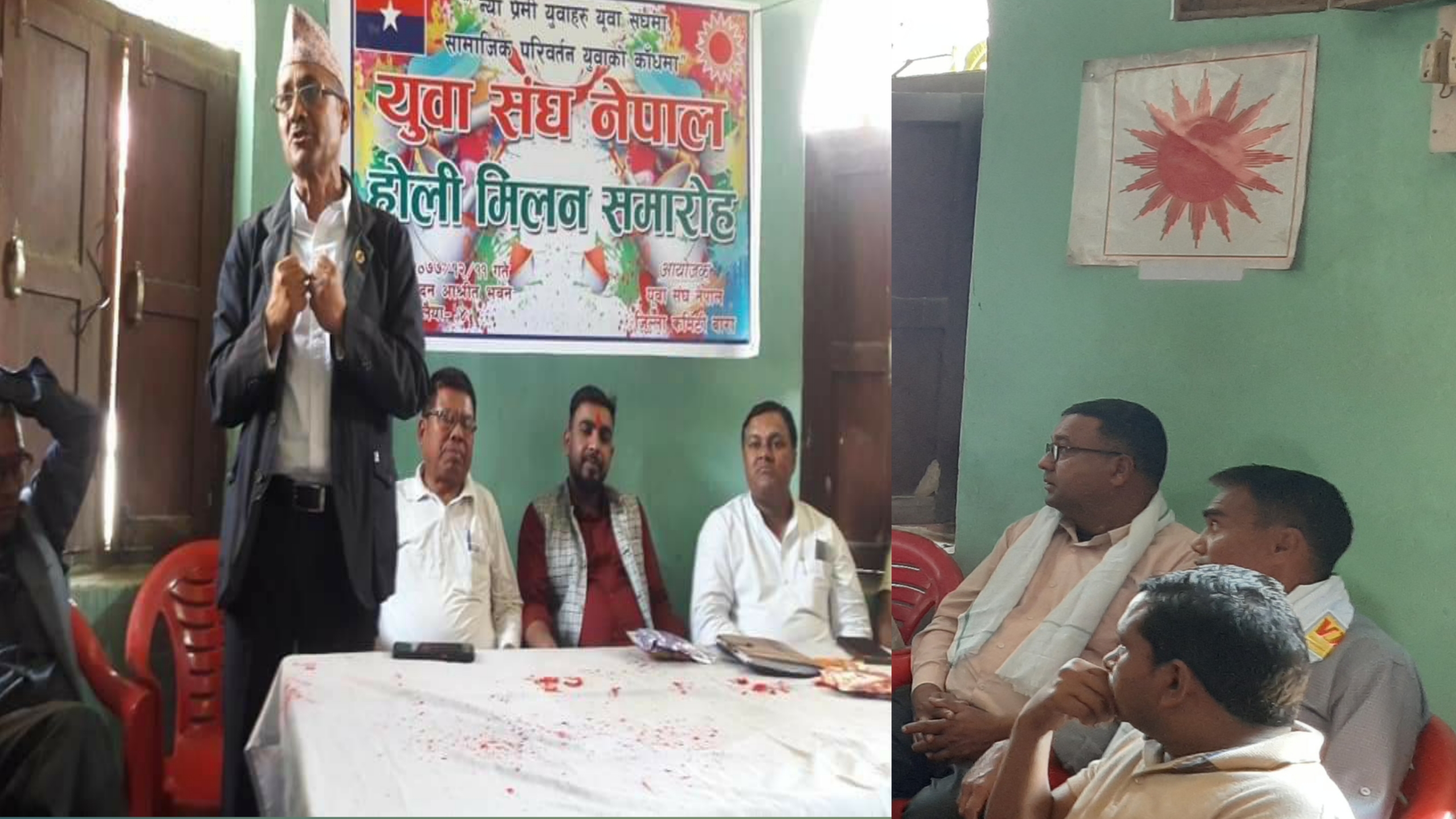 नेकपा एमाले निकट युवासंघ जिल्ला कमिटी बाराले पार्टी कार्यालय कलैयामा होली मिलन कार्यक्रमको आयोजना गरेको छ । जिल्ला कमिटी अध्यक्ष राम यादवको सभापतित्वमा सम्पन्न कार्यक्रममा नेकपा एमाले केन्द्रीय कमिटी सदस्य दिनेश राई, पूर्वमन्त्री तथा नेकपा एमालेका नेता पुरुषोत्तम पौडेल, नेकपा एमाले प्रदेश कमिटी सदस्य सुरेन्द्र यादव, संविधानसभाका सदस्य प्रमोद गुप्ता,एमाले बाराका उपाध्यक्ष देवनारायण चौधरी, एमाले बाराका नेता मनोज पौडेल, युवा सङ्घका केन्द्रीय सचिव अरुण यादव, युवा संघका पूर्वसचिव धुर्व यादव, एमाले बाराका सदस्य कृष्ण खनाल, बिजेन्द्र चौधरी, ढुण्डीराज उप्रेती, कौशल किशोर सिंह, युवा सङ्घका केन्द्रीय सदस्यहरु राजेस पटेल,चण्डीका उप्रेती सापकोटा,अनील भण्डारी,माओवादी केन्द्रका मुकेश साह लगायतले होली मिलनको अवसरमा शुभकामना व्यक्त गर्नुभएको थियो । कार्यक्रमको सहजीकरण रामकुमार भट्टराईले गर्नुभएको थियो ।
