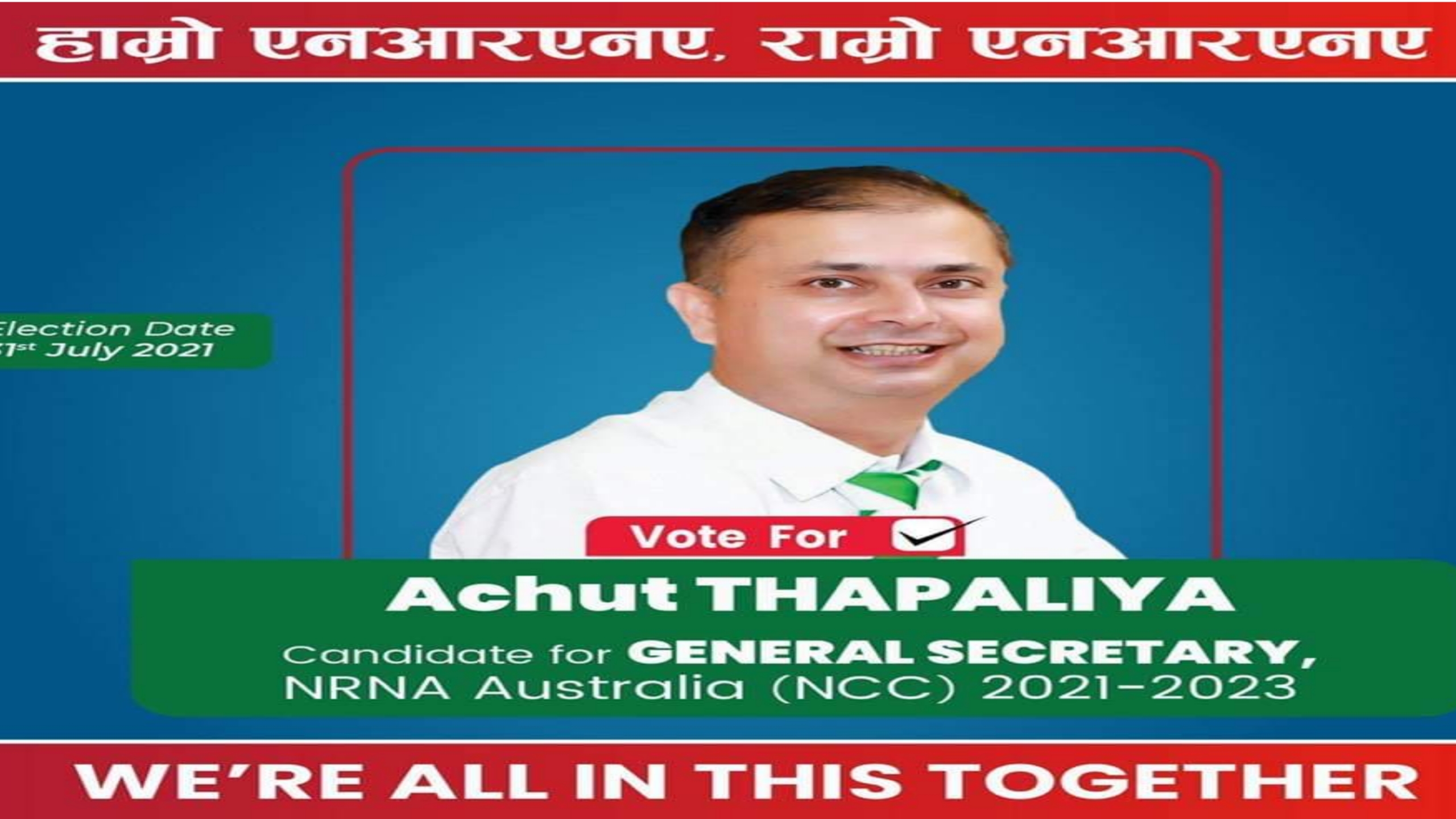 गैरआवासीय नेपाली संघ ( एन आर एन ए ) अस्ट्रेलियाको महासचिवमा अच्युत शर्मा थपलियाले उमेद्वारी दिने घोषणा गर्नुभएको छ । अष्ट्रेलियामा रहेर लामो समय समाज सेवामा लाग्नुभएका शर्मा यस अघि राष्ट्रिय कमिटीको कोषाध्यक्ष तथा सदस्यमा बसेर काम गरी सक्नु भएको छ । हरपल समाजसेवामा लागिरहने थपलियाले आफ्नो उद्देश्य नेपालबाट आएर अस्ट्रेलियामा रहनुभएका नेपालीहरको सेवामा समर्पित गरेको बताउनुहुन्छ । त्यसैले आगामी हुन लागेको निर्वाचनमा महासचिवमा आफनो जित सुनिश्चित रहेको शर्माको दाबी छ ।