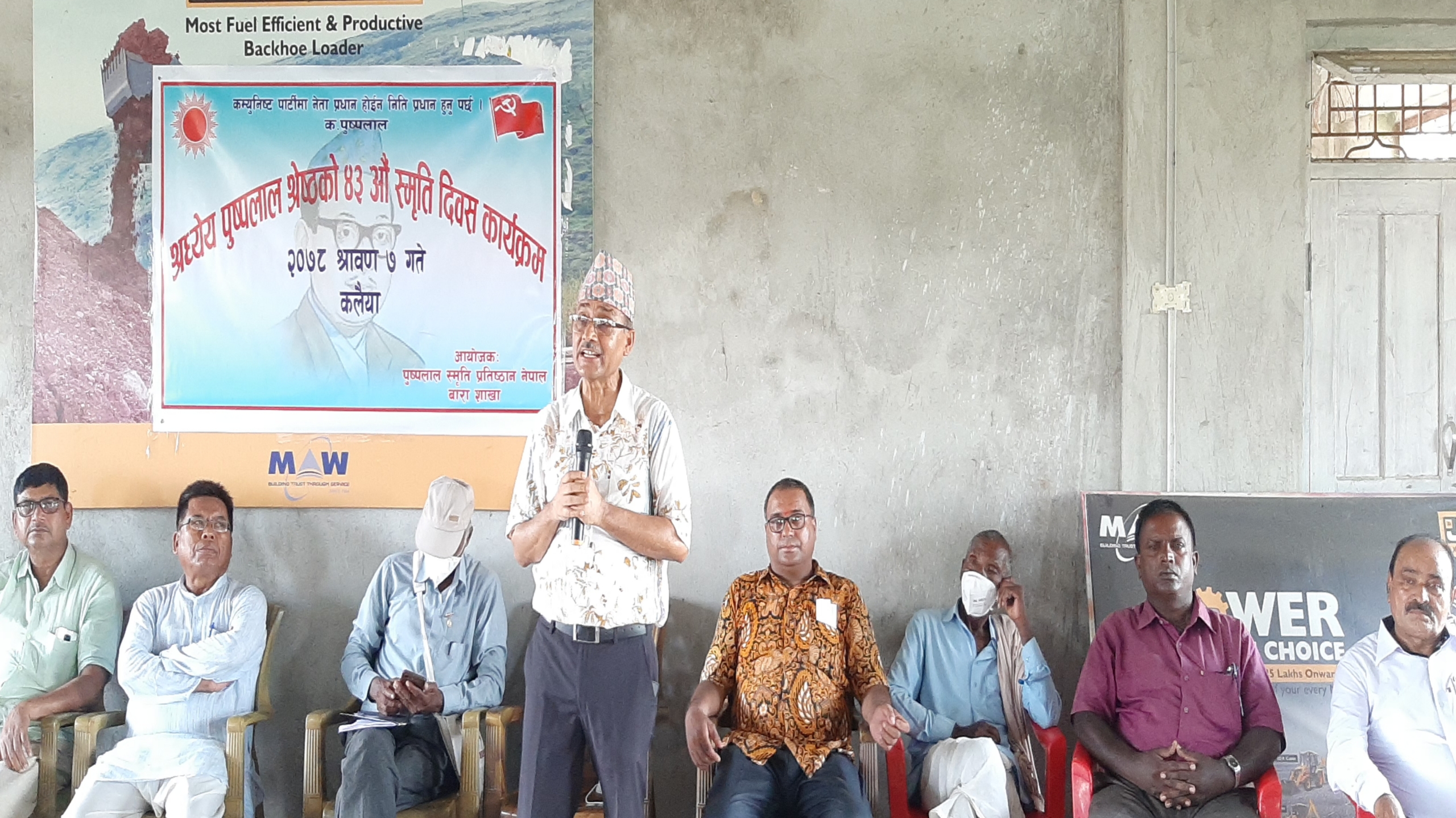 पुष्पलाल स्मृति प्रतिष्ठान बाराका अध्यक्ष पलट प्रसाद चौधरीको सभापतित्वमा सम्पन्न कार्यक्रममा नेकपा एमालेकी नेतृ सिता गुरुङ, एमाले नेताहरु श्रीप्रसाद पासवान, देव नारायण चौधरी , मनोज पौडेल,महमद समिउल्लाह, अनिल मैनाली,कौशल किसोर सिंह लगायतले पुष्पलालले कम्युनिष्ट आन्दोलनमा पुर्याउनुभएको योगदानको चर्चा गर्नुभएको थियो । कार्यक्रम निर्माण व्यवसायी सङ्घ कलैयाको हलमा सम्पन्न भएको हो ।
