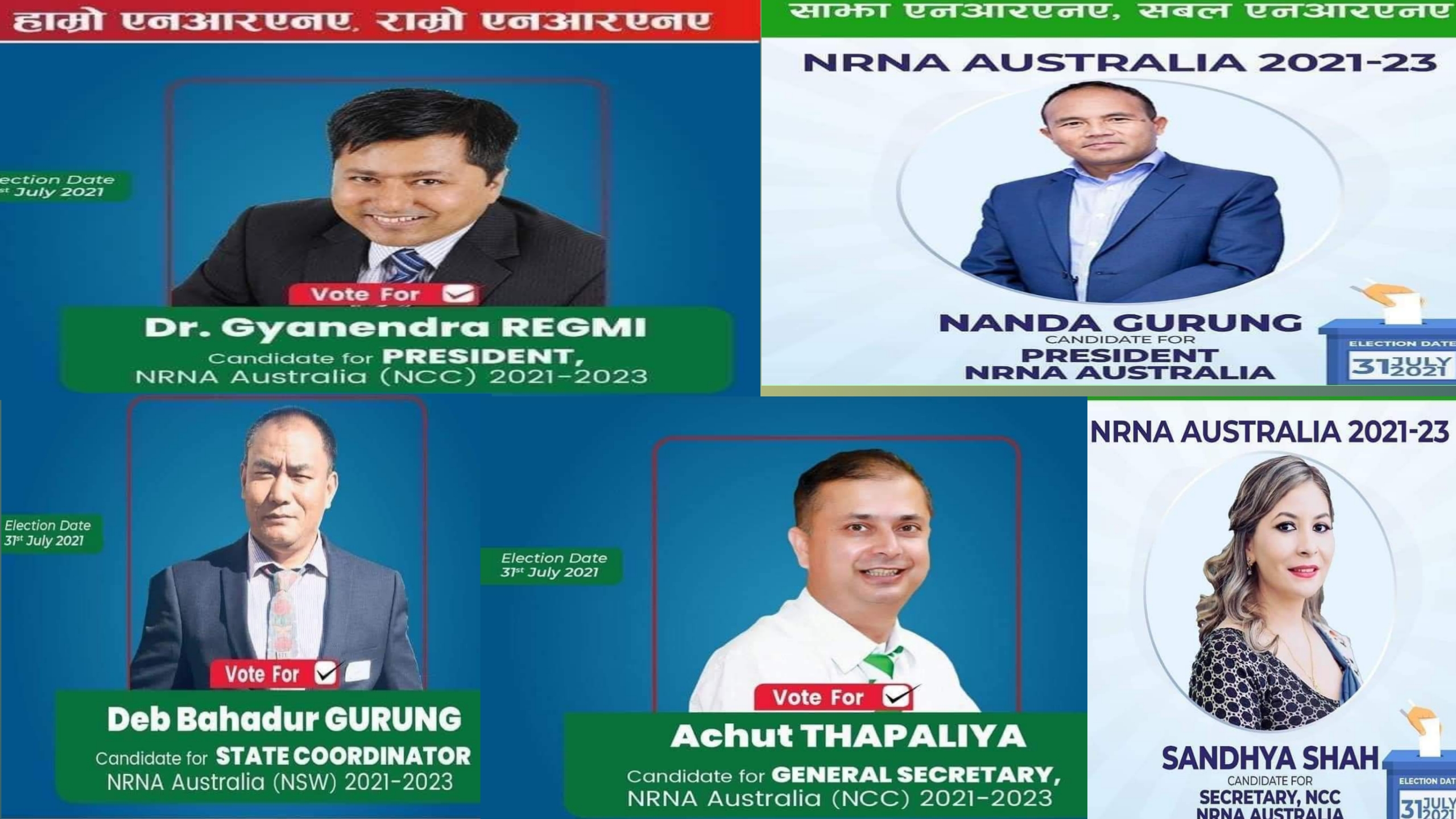 गैरआवासीय नेपाली संघ (एन आर एन ए )अस्ट्रेलियाको भोलि जुलाई ३१ गते हुने निर्वाचनका डा. ज्ञानेन्द्र रेग्मी र नन्द गुरुङको नेतृत्वमा दुई वटा प्यानल बनाएर चुनावी मैदानमा उत्रिएका छन । ज्ञानेन्द्र रेग्मीको प्यानलमा सभापतिमा ज्ञानेन्द्र रेग्मी, उपसभापतिमा देवबहादुर गुरुङ, महासचिवमा अच्युत थपलिया रहनुभएको छ । त्यसैगरी सचिवमा तिर्थ राज कार्की, युवा संयोजक महेश पर्साइ रहेका छन् त्यसैगरी सह कोषाध्यक्षमा कर्ण यादव उम्मेदवार रहेका छन । आइ सि सि सदस्यमा राजकुमार अधिकारी, सरोज राज पांडे, मेघराज पौडेल धर्म अधिकारी अनन्त एलेक्स कार्की, दिक्पालदेव पंगेनी, चन्द्रप्रसाद ढकाल र चिनबहादुर नेपाली रहेका छन् । त्यसैगरी कार्यसमितिको सदस्यमा राजु गिरी,अशोक उप्रेती दामोदर अधिकारी,निशान पोखरेल,कृष्ण सुवेदी र कमल भण्डारी रहेका छन् ।