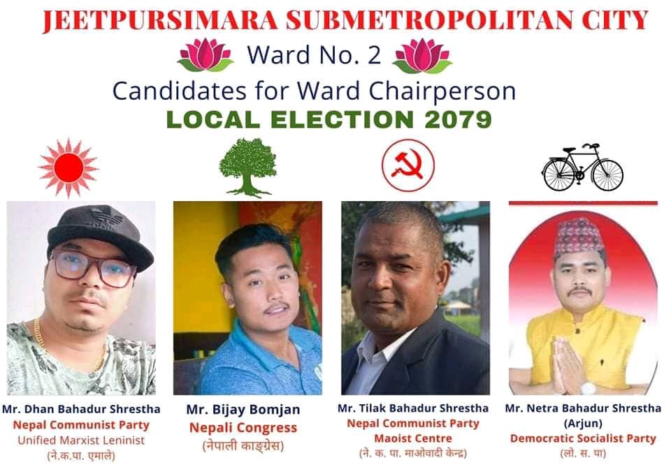 सिमरा, स्थानीय निर्वाचन – २०७९ मा मतदान गर्न करिब १० दिन मात्र बाकि छ। निर्वाचन नजिकिदै जादा सबै राजनैतिक दलले आफ्नो चुनावी अभियानलाई तिब्रता दिएका छन्। जीतपुरसिमरा उपमहानगरपालिकाको नगर प्रमुख र उप – प्रमुख पदका लागि पाच दलिय गठबन्धन गरेका गठबन्धनमा आबद्द राजनैतिक दलले वडा तहमा भने एक आपसमा प्रतिष्प्रधा गर्दै छन्। जीतपुरसिमराको प्रमुख र महत्वपुर्ण वडाको रुपमा लिईने वडा नम्बर २ मा पनि चुनावी माहोल बढेको छ। बिबिध हिसाबले अन्य वडा भन्दा सुबिधा सम्पन्न मानिएको यस वडालाई सबै राजनैतिक दलले प्रतिष्ठाको बिषय समेत बनाउने गर्दछन्। जीतपुरसिमरा २ को नेतृत्व लिन यति खेर नेकपा एमालेको तर्फबाट धन बा. श्रेष्ठ , माओबादी केन्द्रको तर्फबाट तिलक बहादुर श्रेष्ठ , नेपाली कांग्रेसको तर्फबाट विजय बोम्जन, लोकतान्त्रिक समाजवादी पार्टीका तर्फबाट नेत्र बहादुर श्रेष्ठ र राष्ट्रिय प्रजातन्त्र पार्टीका तर्फबाट यादव अधिकारी चुनावी मैदानमा छन्।