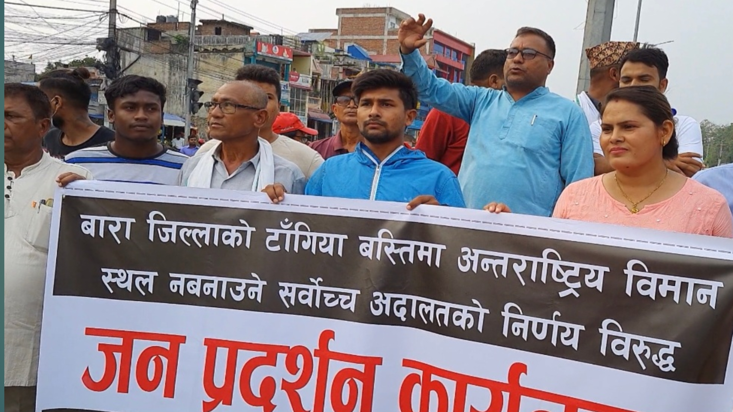 बाराको टागियामा निर्माण हुने भनिएको दोस्रो अन्तराष्ट्रिय बिमानस्थल नबानाउन सर्बोच्च अदालतले गरेको फैसला बिरूद्ध बाराको जितपुरसिमरामा जनप्रदर्शन कार्यक्रम सम्पन्न भएको छ । जितपुरसिमरा सार्वजनिक सरोकार समितिको आयोजनामा भएको बिरोध कार्यक्रम सिमरा चोकबाट सुरू भएर र्याली सहित बजार परिक्रमा गरी मुख्य चोकमा पुगेर कोणसभाम परिणत भयो । कोण सभामा बोल्दै सरोकार समितिका संयोजक मनोज पौडेलले सर्बोच्च अदालतको आदेश बिकास बिरोधि रहेको बताए । एमालेक नेता समेत रहेका पौडेलले मधेश प्रदेशकै महत्वपूर्ण राष्ट्रिय गौरबको आयोजना बन्न नदिन जारी भएको आदेश डलरे एनजियो बाट परिचालित रहेको समेत बताए । पौडेलले बाताबरणको नाममा बिकास रोकेर देश समृद्ध हुन नसक्ने जिकिर गरे । टागिया बस्तीलाई उचित व्यवस्थापन गरेर बिमानस्थल बनाउनुको कुनै बिकल्प समेत नरहेको बताए । कार्यक्रममा भबानिपुर जितपुर गाबिसका पुर्ब अध्यक्ष देव नारायण चौधरी, दिनेश्वर ठाकुर लगायत नेता तथा स्थानियको सहभागिता रहेको थियो । कार्यक्रमको सहजीकरण रबिन्द्र खकुरेलले गरेका थिए ।