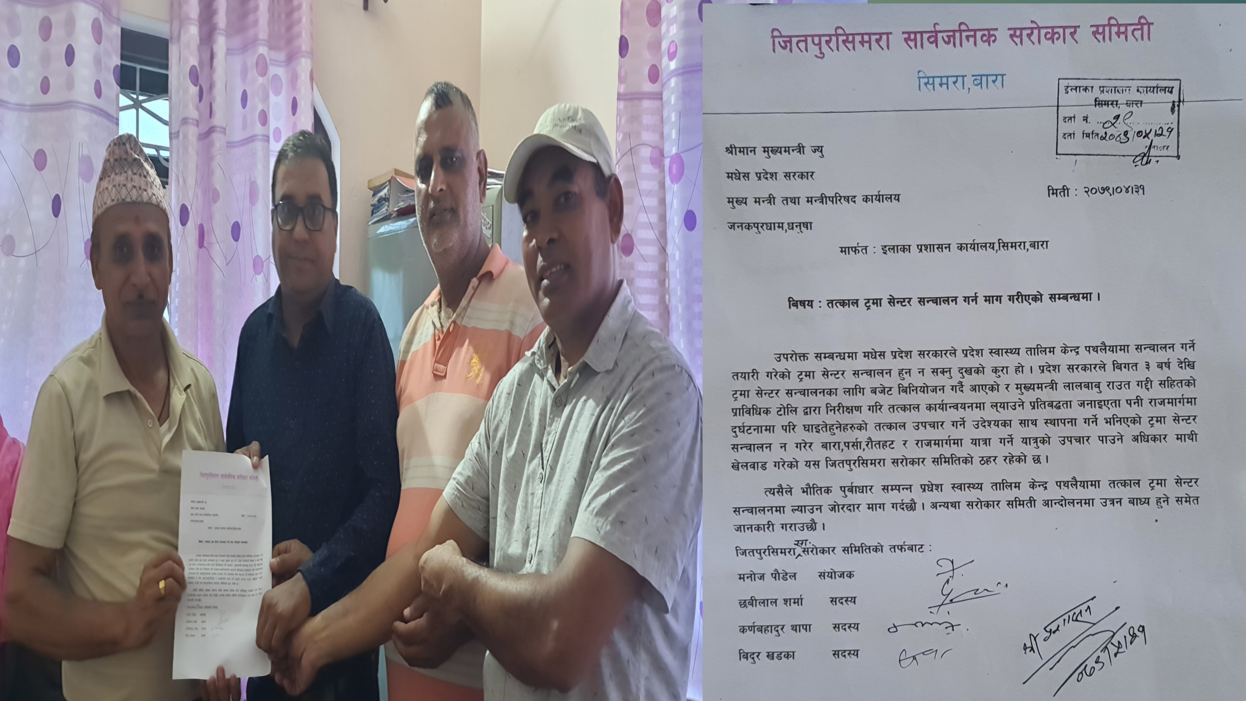 मागपत्रमा मधेस प्रदेश सरकारले प्रदेश स्वास्थ्य तालिम केन्द्र पथलैयामा सन्चालन गर्ने तयारी गरेको ट्रमा सेन्टर सन्चालन हुन न सक्नु दुखको कुरा हो । प्रदेश सरकारले बिगत ३ बर्ष देखि ट्रमा सेन्टर सन्चालनका लागि बजेट बिनियोजन गर्दै आएको र मुख्यमन्त्री लालबाबु राउत गद्दी सहितको प्राविधिक टोलि द्वारा निरीक्षण गरि तत्काल कार्यान्वयनमा ल्याउने प्रतिबद्धता जनाइएता पनी राजमार्गमा दुर्घटनामा परि घाइतेहुनेहरुको तत्काल उपचार गर्ने उदेश्यका साथ स्थापना गर्ने भनिएको ट्रमा सेन्टर सन्चालन न गरेर बारा,पर्सा,रौतहट र राजमार्गमा यात्रा गर्ने यात्रुको उपचार पाउने अधिकार माथी खेलवाड गरेको यस जितपुरसिमरा सरोकार समितिको ठहर रहेको मागपत्रमा भनिएको छ ।