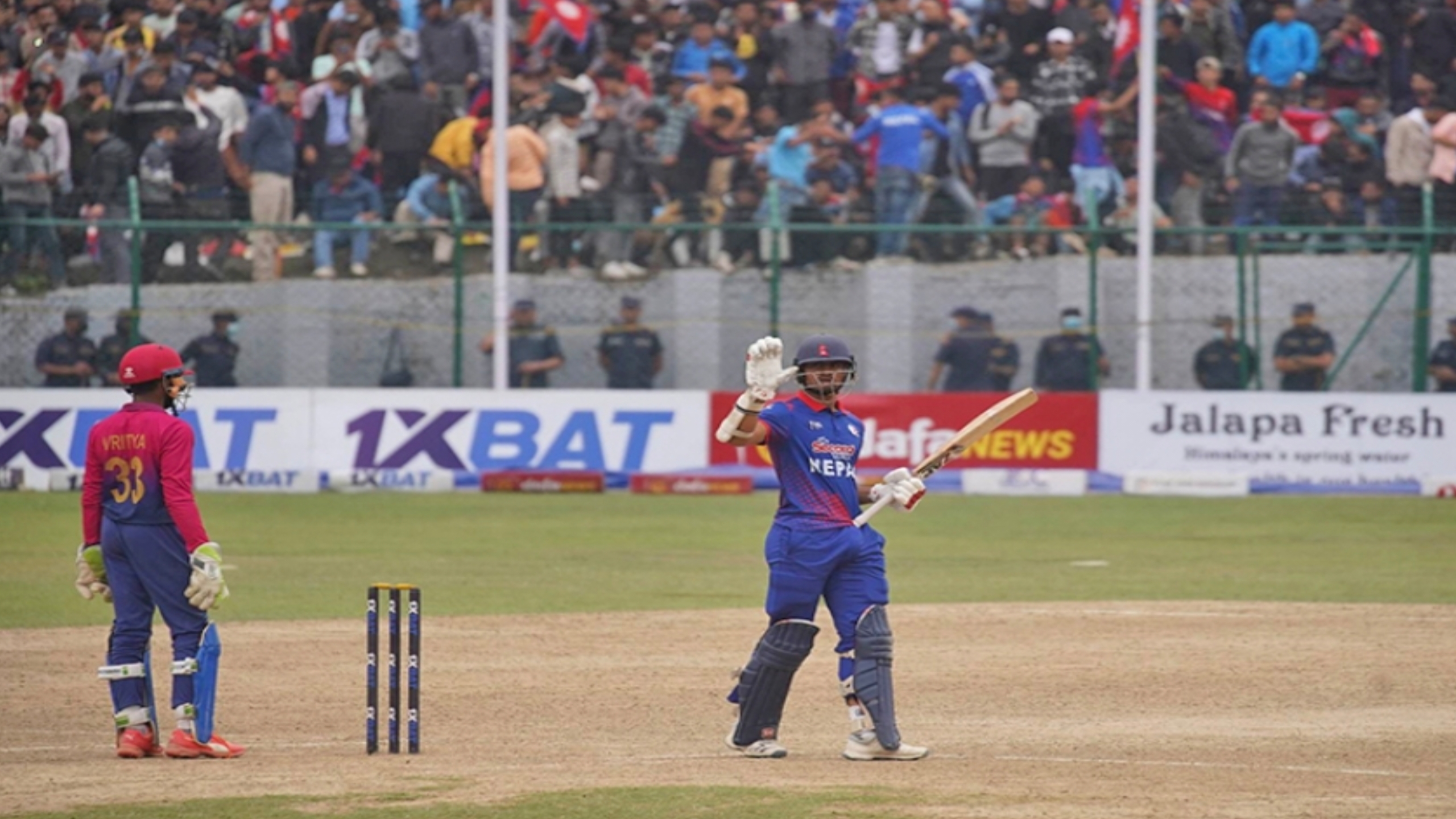 नेपालका तीन ब्याटर दोहोरो अंकमा रन बनाउन नसकी आउट हुँदा गुलसन झाले ८४ बल खेल्दै ३ चौका र ६ छक्काको मद्दतमा सर्वाधिक ६७ रनको अविजित इनिङ खेले । भने, भीमले ७२ बल खेल्दा ४ चौकाको मद्दतमा ३६ रन बनाए ।