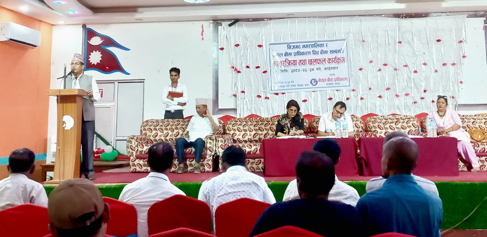 नेपाल बीमा प्राधिकरणको आयोजनामा बाराको निजगढ नगरपालिकामा भएको बीमा सम्बन्धि एक दिने अन्तक्रिया कार्यक्रममा बोल्दै प्रमुख अतिथि समेत रहनुभएका नगर प्रमुख पुरीले किसानको हकहितका लागि बीमा कार्यक्रमलाई जोड्दै अगाडि बढ्ने बताउनुभएको हो ।